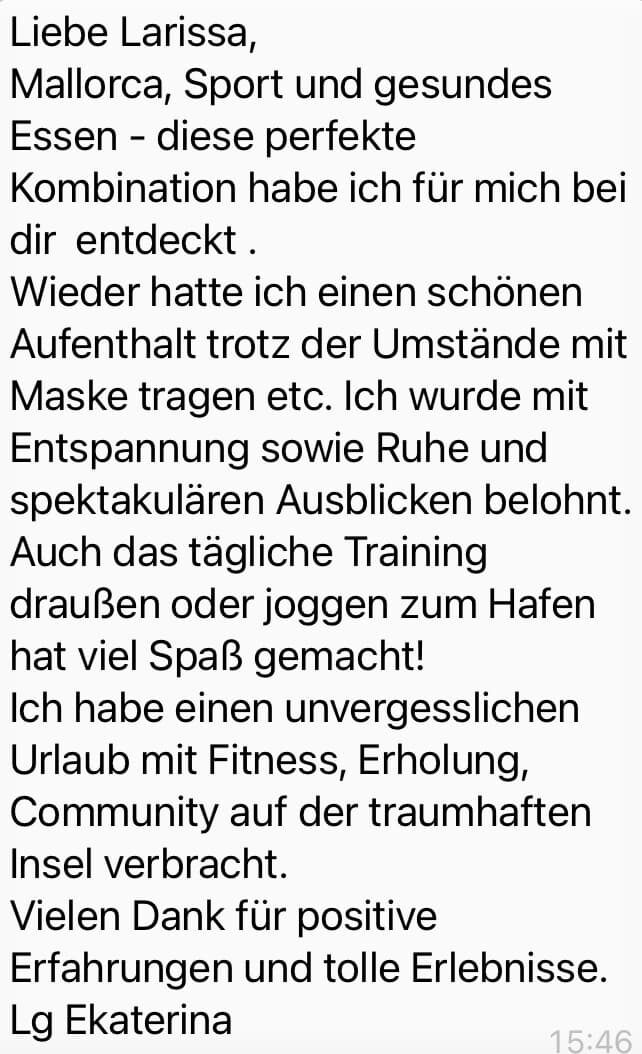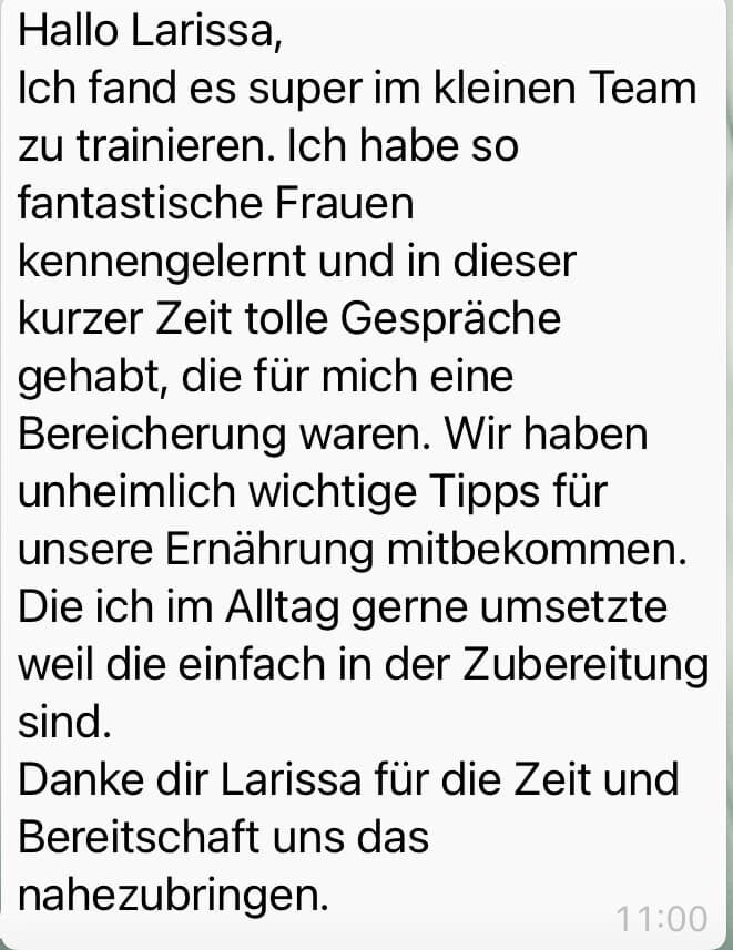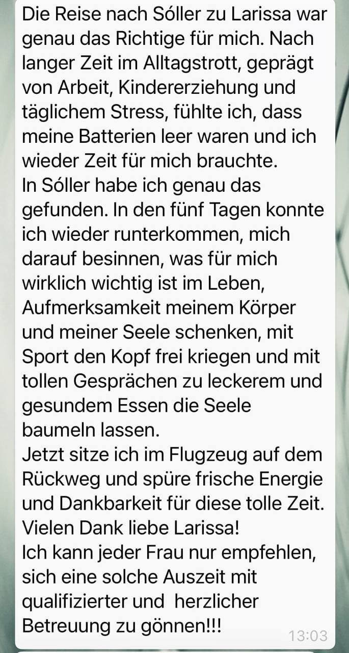 Vielen herzlichen Dank an Larissa, an die unglaublichen Mädels. Ich kann es nur jedem empfehlen, sich auf diese Reise zu begeben. Auf die Reise zu sich selbst. Gemeinsam mit Larissa setzt man sich die Ziele und beschreitet den Weg.
